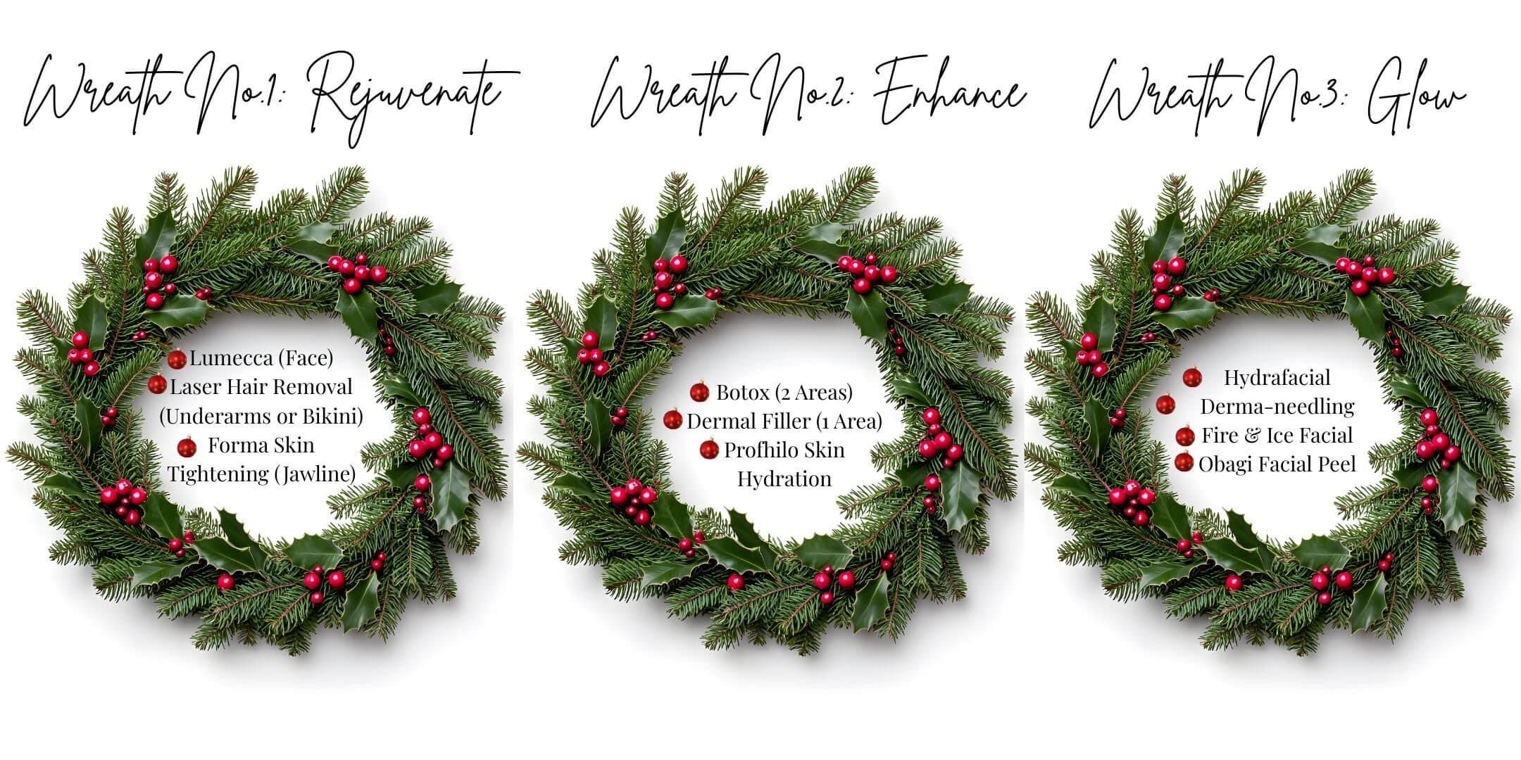 Mix and match one treatment from each wreath to create your perfect festive beauty package — designed to help you look refreshed, confident, and beautifully radiant for the party season while enjoying incredible savings. Choose from: Wreath No.1: Rejuvenate: Lumecca, Laser Hair Removal or Forma Skin Tightening |